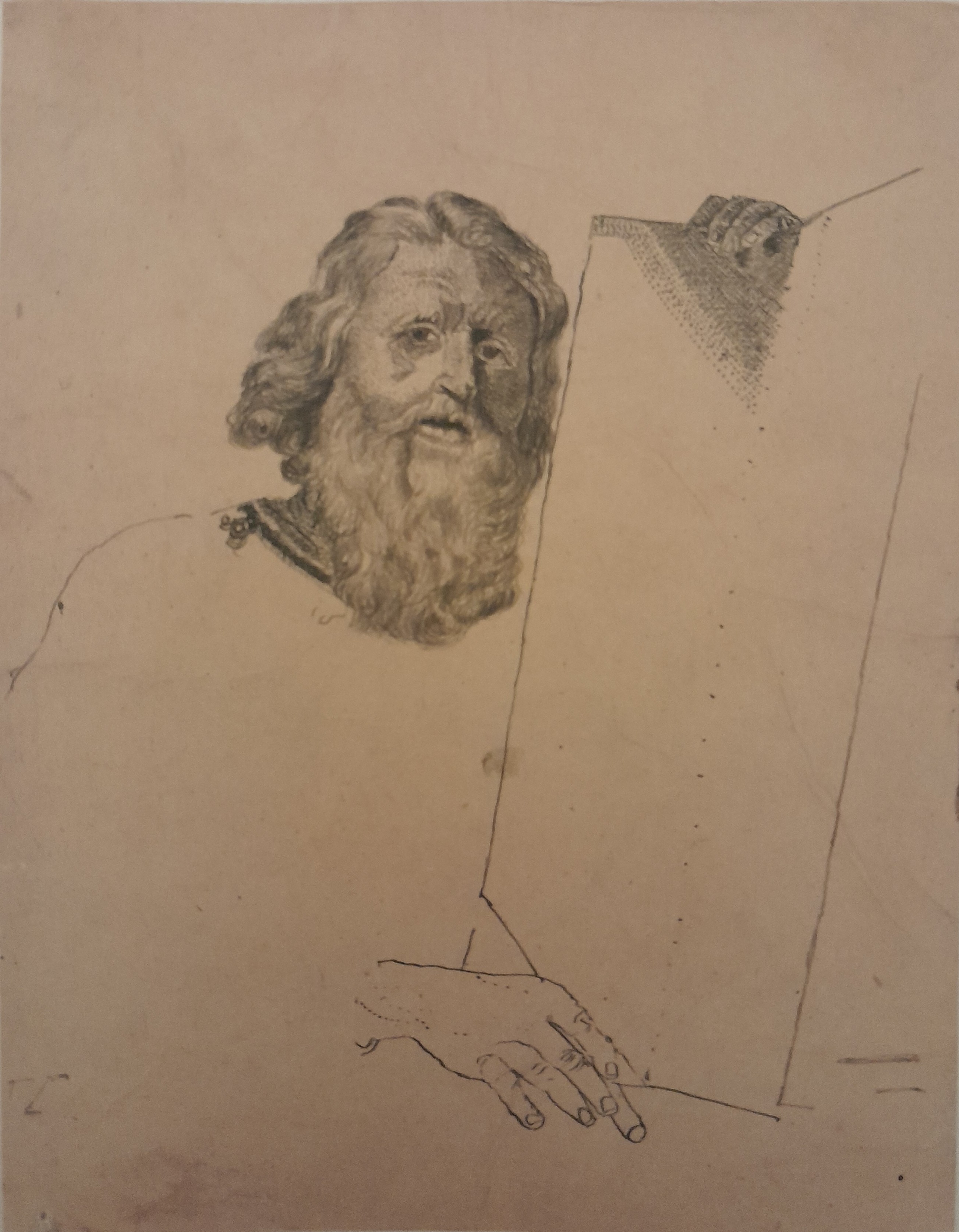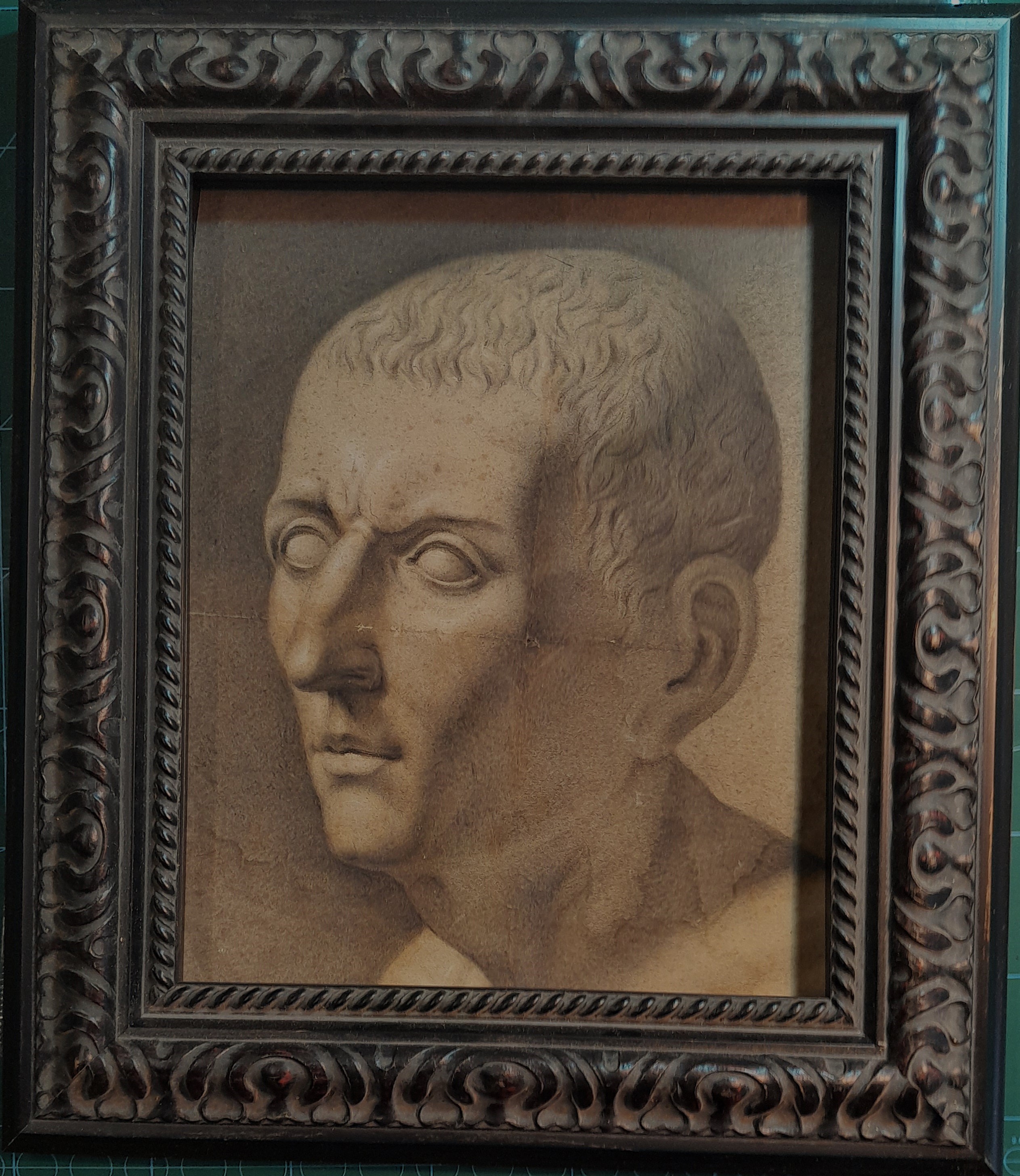 Description: Drawing in ink, 17th/18th-century male face portrait, on paper. Theme: portrait study, academic. Not signed by the artist. Attributed to artist Sir George Howland Beaumont, 7th Baronet (1753–1827). He played a crucial part in the creation of London's National Gallery by making the first bequest of paintings to that institution. He was also the president of the British Institution, which was established in 1806 to provide an alternative exhibition space to the Royal Academy.