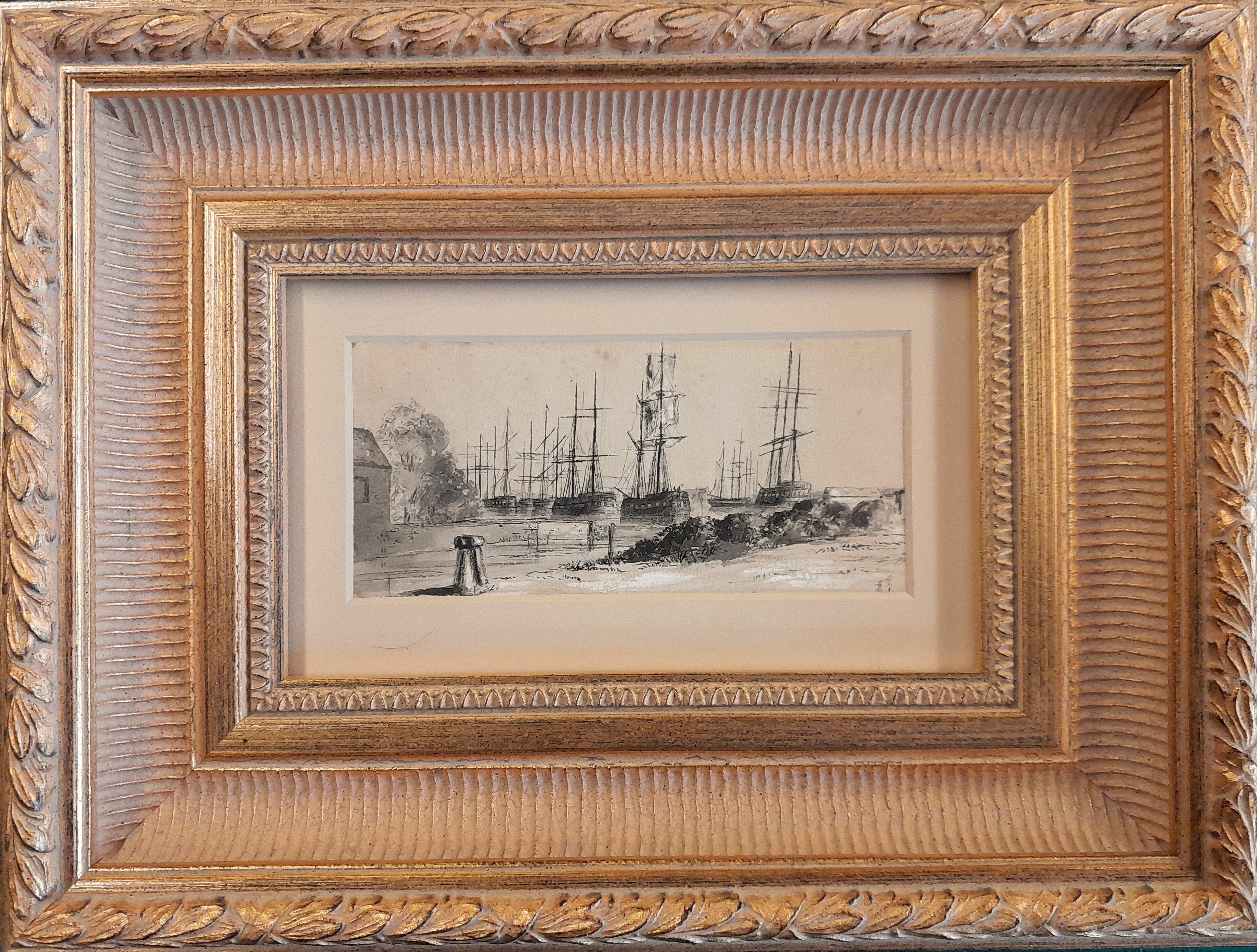 Description: A very detailed and well executed little pen & ink watercolour on paper of Lord Nelsons Fleet moored up, late 18th/19th century. The artists signature is on the rear of the artwork. The artwork is in a new frame with UV image clear glass. The rear of the frame also has glass so the artists signature is visible.