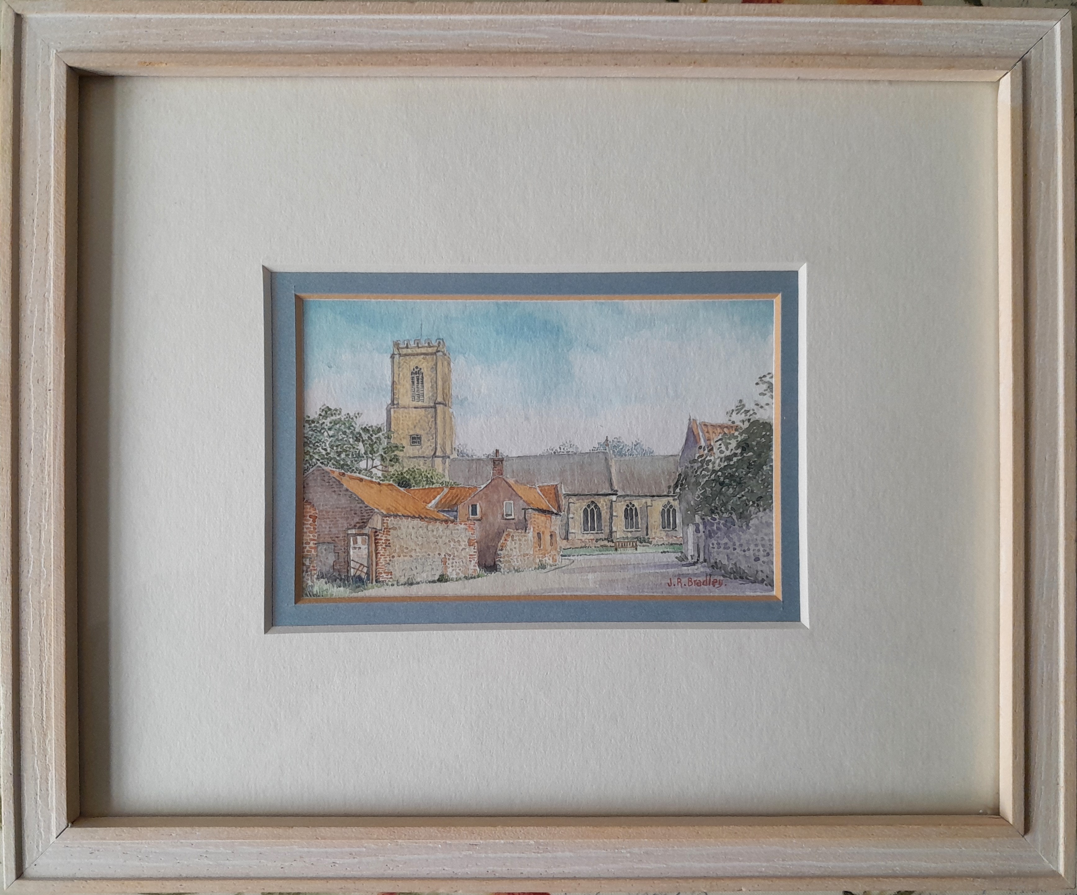 Description: This is an extremely well executed detailed small artwork of the village Southrepps Norfolk, signed by J.R. Bradley
