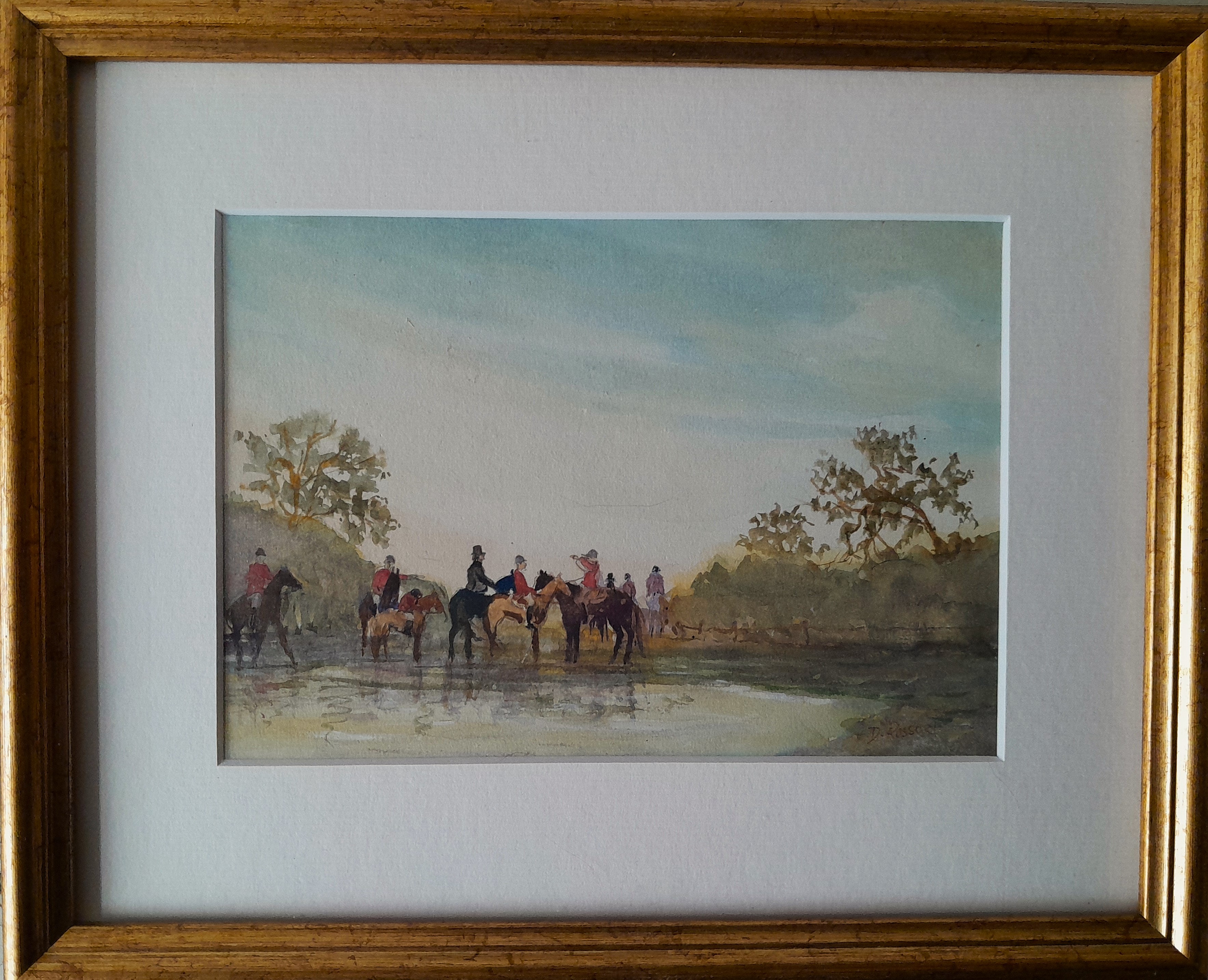 Description: Watercolour of a fox hunting scene. Framed and mounted with UV image clear glass. Daniel Russo (1832–1902) is a postwar & contemporary artist. Daniel Russo is a professor of mediaeval art history at the University of Bourgogne. Very little is known about him, and his work is rare. Daniel is also co-author of a book titled The History of Venice in Painting.