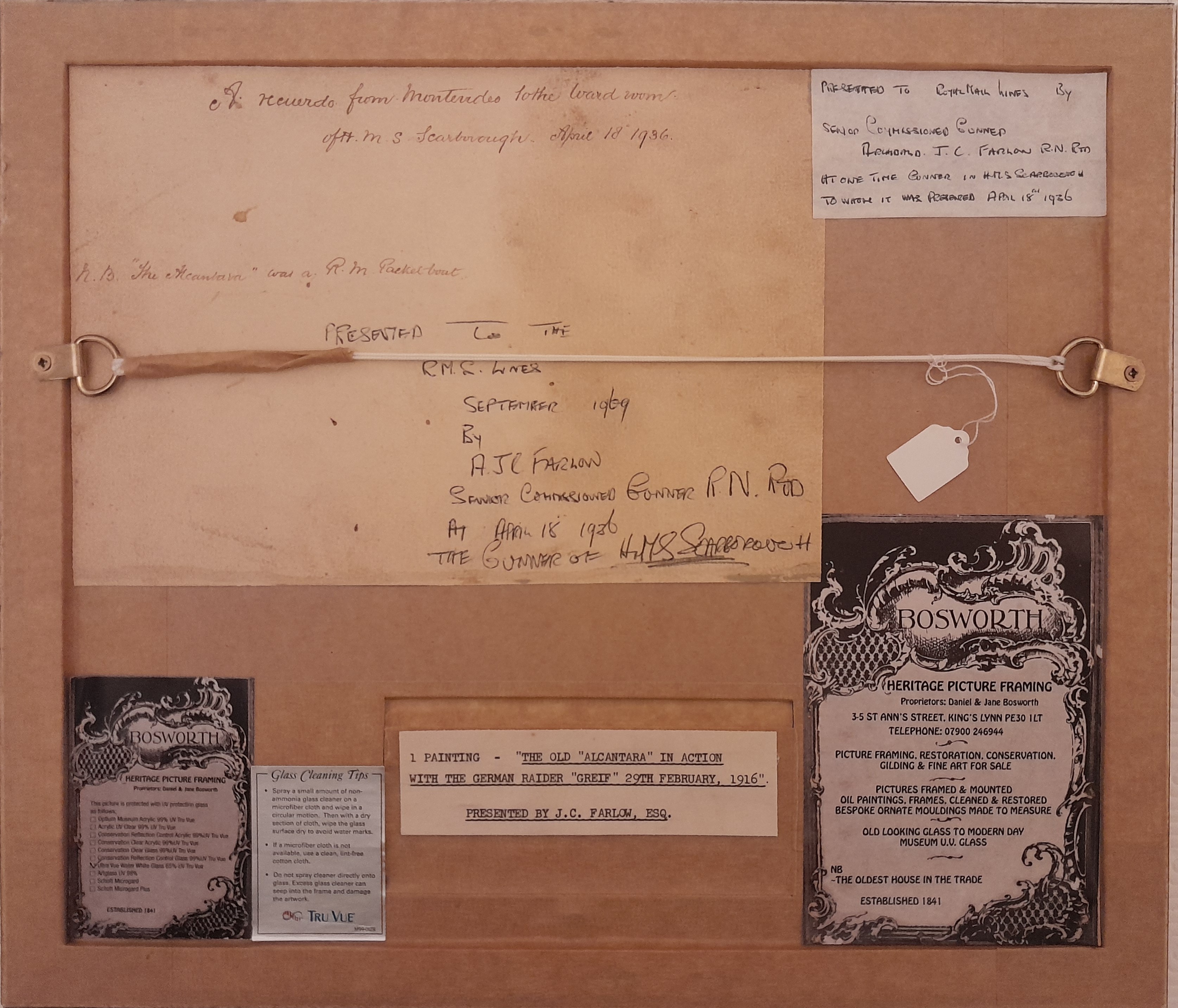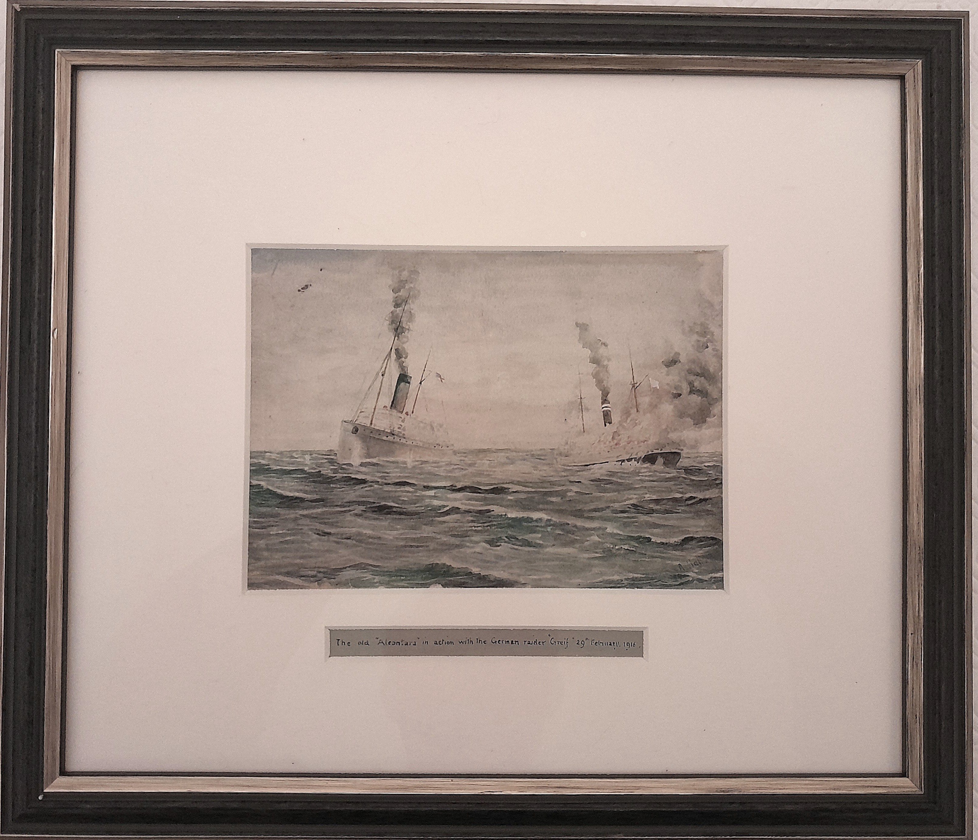 Description: Watercolour by artist A. Hall. The artwork is of the old Alcantara in action with the German Raider "Greif" 29th February 1916. The artwork was presented to Royal Mail Lines by Senior Commissioned Gunner J.C. Farlow RN, one time Gunner in H.M.S. Scarborough, April 18th 1936.