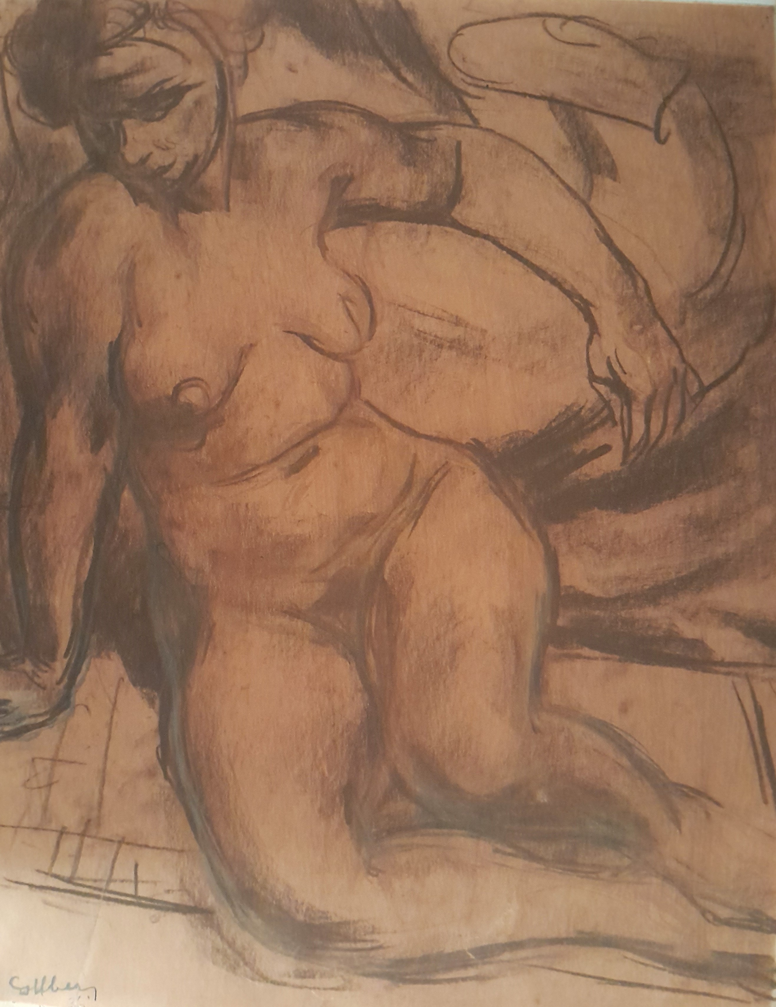 Description: Drawing/sketch by Michael Gilbery R.A., dated 1936. A naked woman getting out of bed. The artwork is framed with image-clear UV glass. Michael first gained recognition when, at the age of seventeen, his portrait of his father was exhibited in the Royal Academy and was hailed a triumph by a number of leading critics. Michael was also commissioned to paint the Royal Historic Cavalcade for George VI coronation.