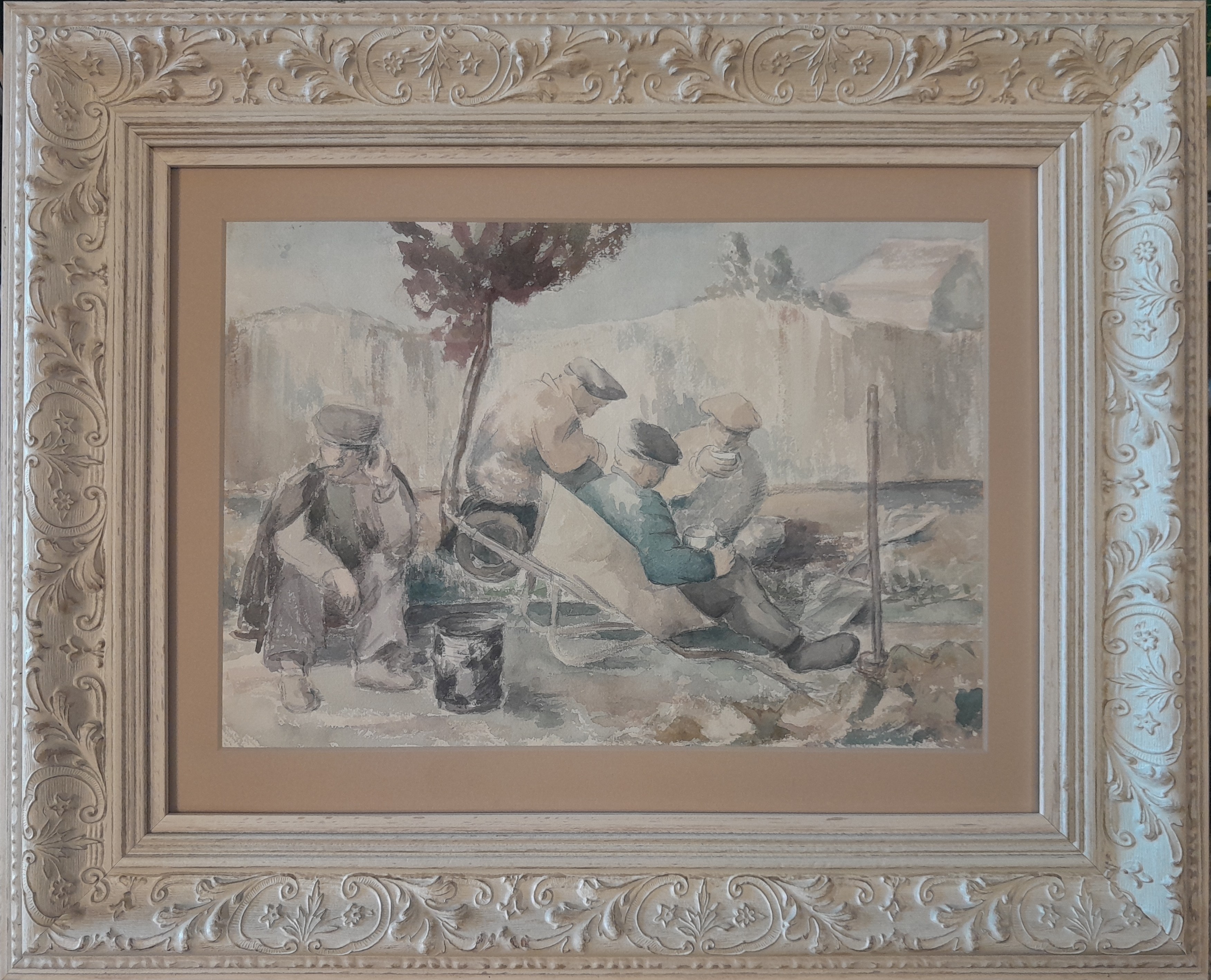 Description: Watercolour attributed to Edward Jeffrey Irving Ardizzone CBE, RA (16 October 1900 – 8 November 1979). Framed in a wooden moulded frame and mounted with image clear UV glass. On the rear of the artwork in pencil: “Starting The Job”, Carleton Avenue, Wallington (SM6 9LW). Edward Ardizzone was born in the port city of Haiphong, then known as Tonkin, in the north of French Indo-China, Edward Jeffrey Irving Ardizzone was an English painter, print-maker and war artist, and the author and illustrator of books. Edward worked part-time as an instructor in graphic design at Camberwell School of Art and as a visiting tutor at the Royal College of Art. The British Library published an illustrated bibliography of his works in 2003. A blue plaque unveiled in 2007 commemorates Ardizzone's home at 130 Elgin Avenue in Maida Vale.
