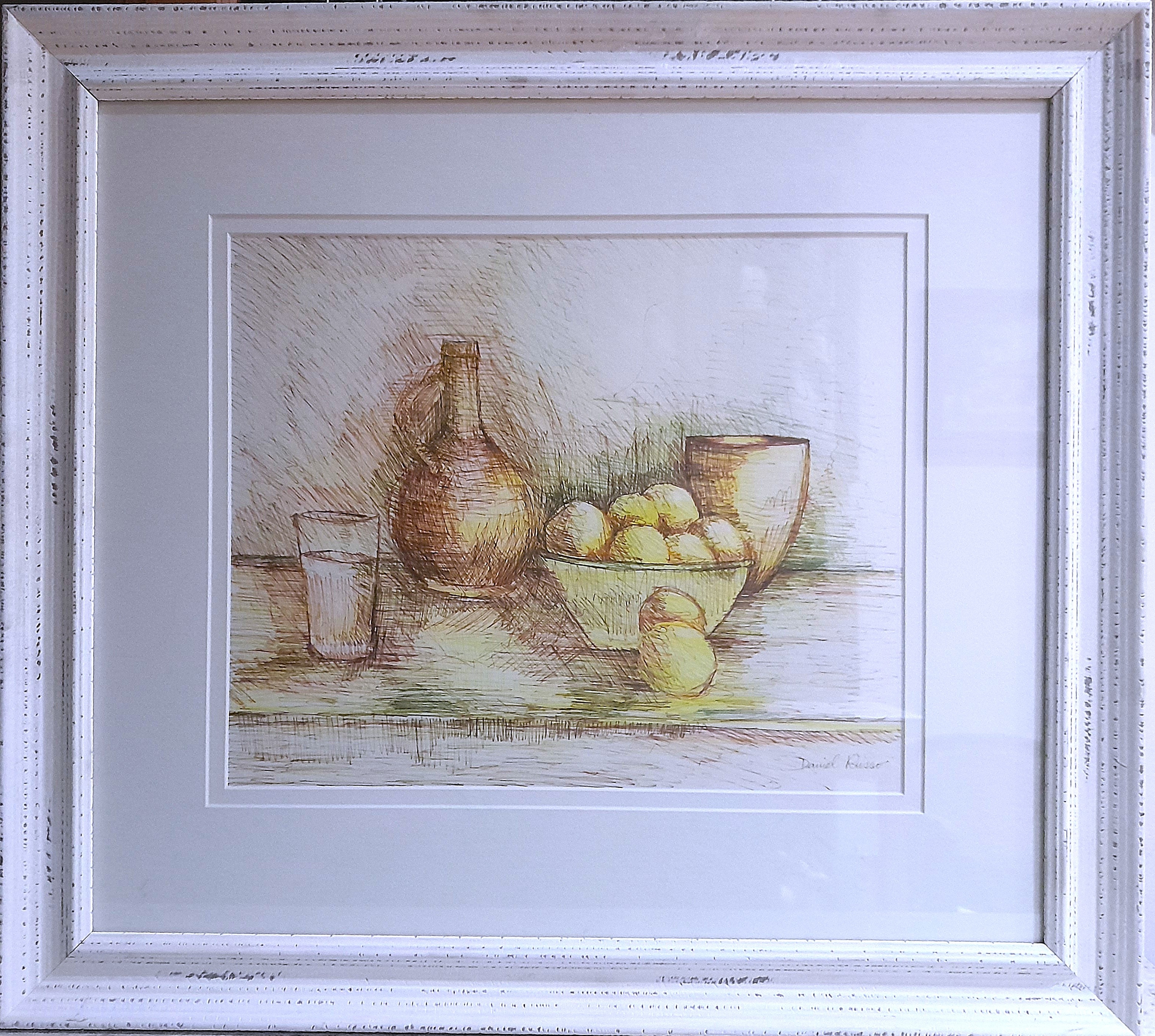 Description: Multi-coloured ink sketch of a still life scene. Framed and mounted. Daniel Russo (1832–1902) is a postwar & contemporary artist. Daniel Russo, professor of mediaeval art history at the University of Bourgogne, very little is known about him, and his work is rare. Daniel is also co-author of a book titled The History of Venice in Painting.