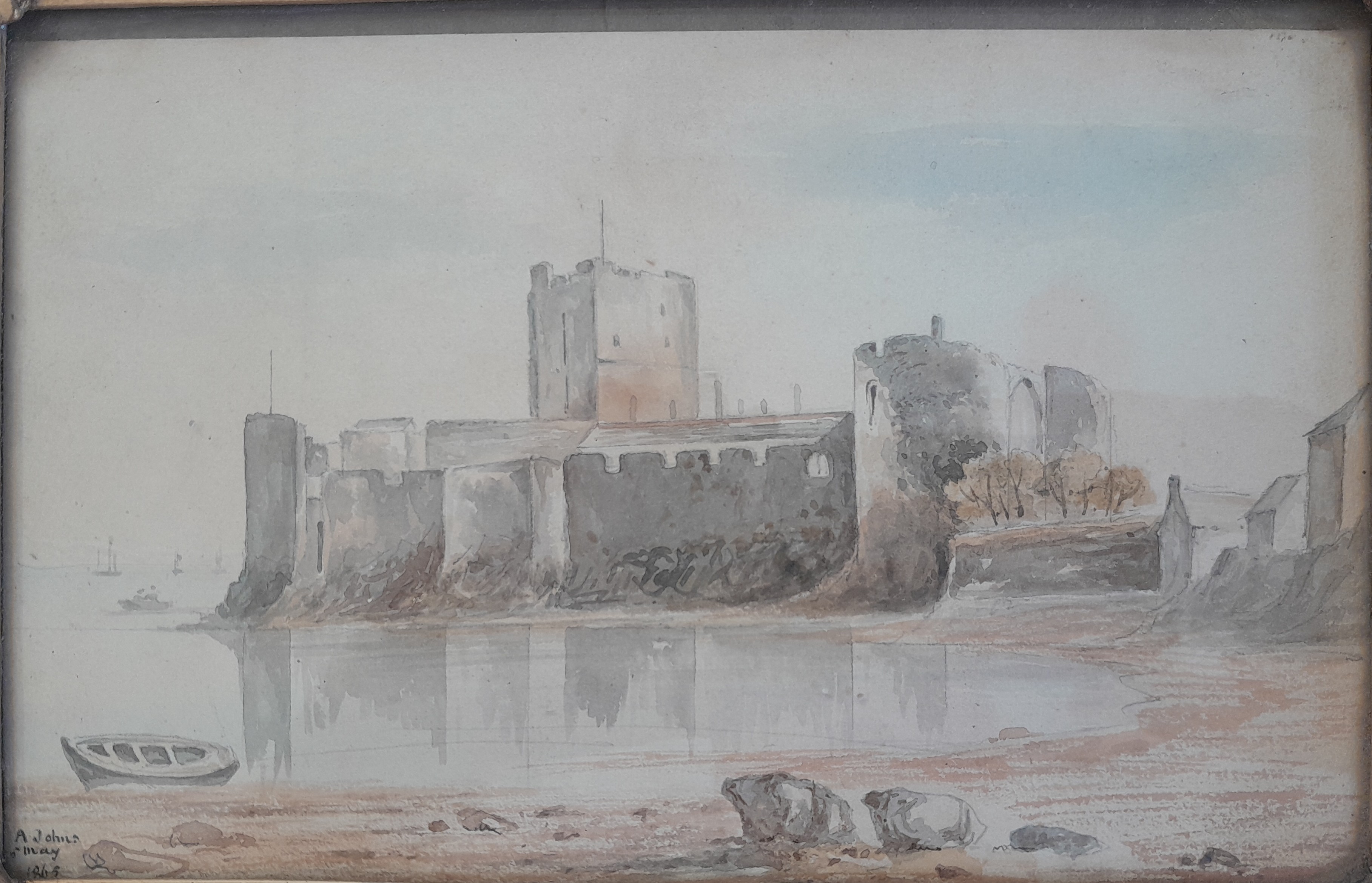 Description: Artist A. Johns, signed & dated Irish watercolour of Carrickfergus Castle, Co. Antrim. Date May 1865. Framed in original ornate gilt frame, glass and backing boards with label. The frame has been refurbished because of damage over the years.