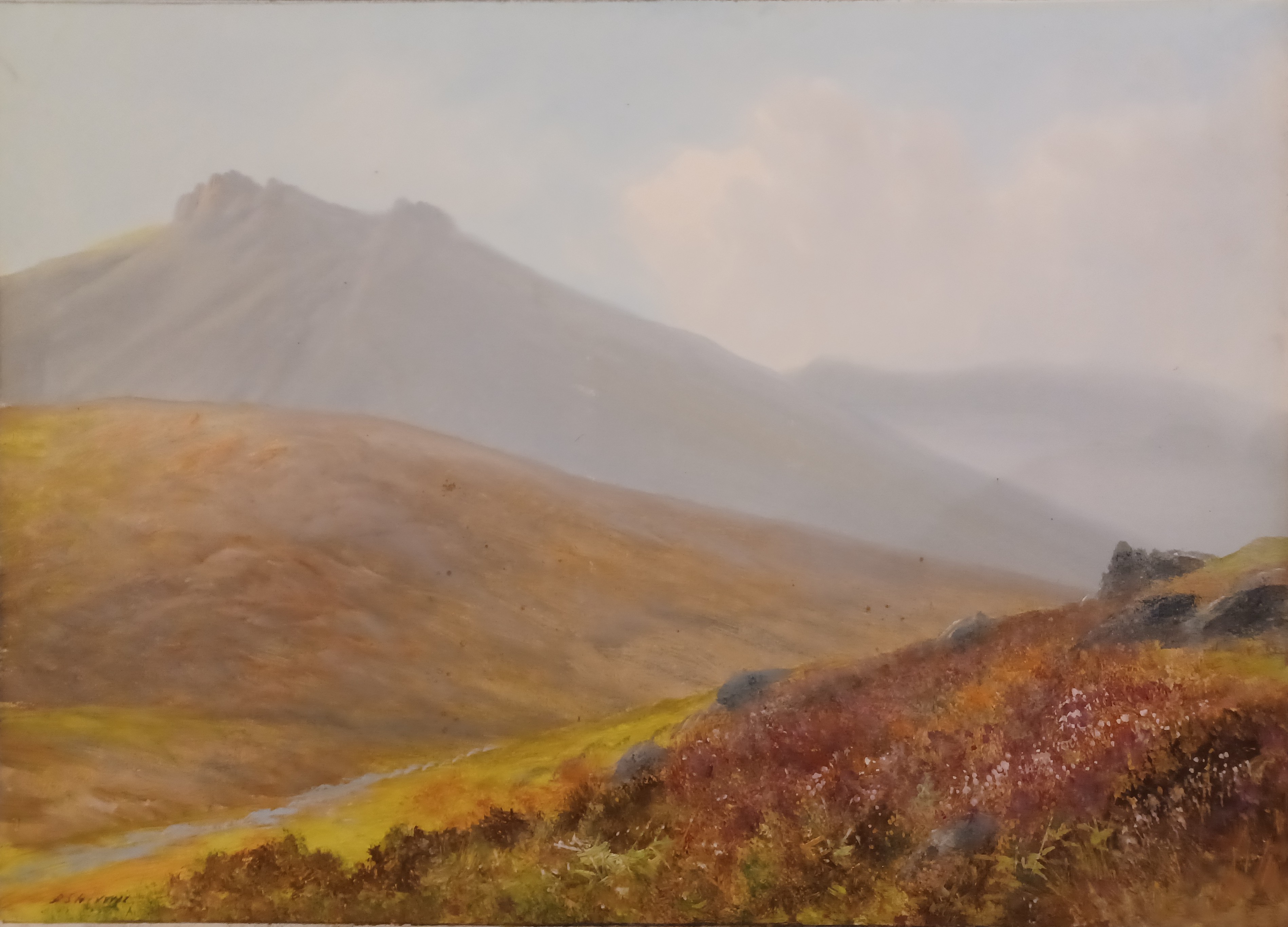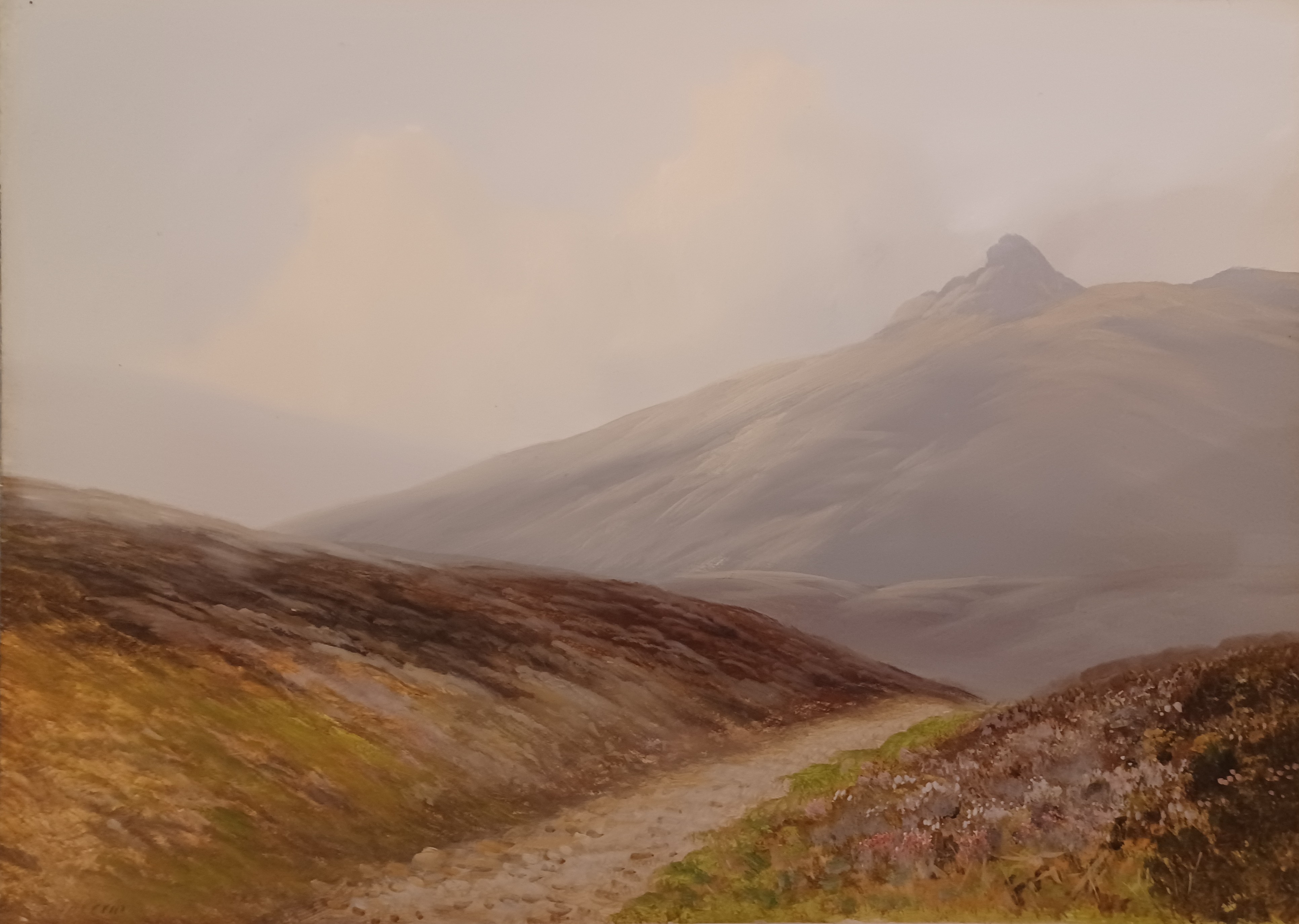 Description: Watercolour, gouache and signed Daniel Sherrin (1868-1940), - Dartmoor Landscape. Daniel Sherrin an English artist known for his detailed landscapes and Scottish scenes, including a painting for King George V. The painting depicts a rugged, Dartmoor landscape with a path. The artwork is framed in UV image clear glass.