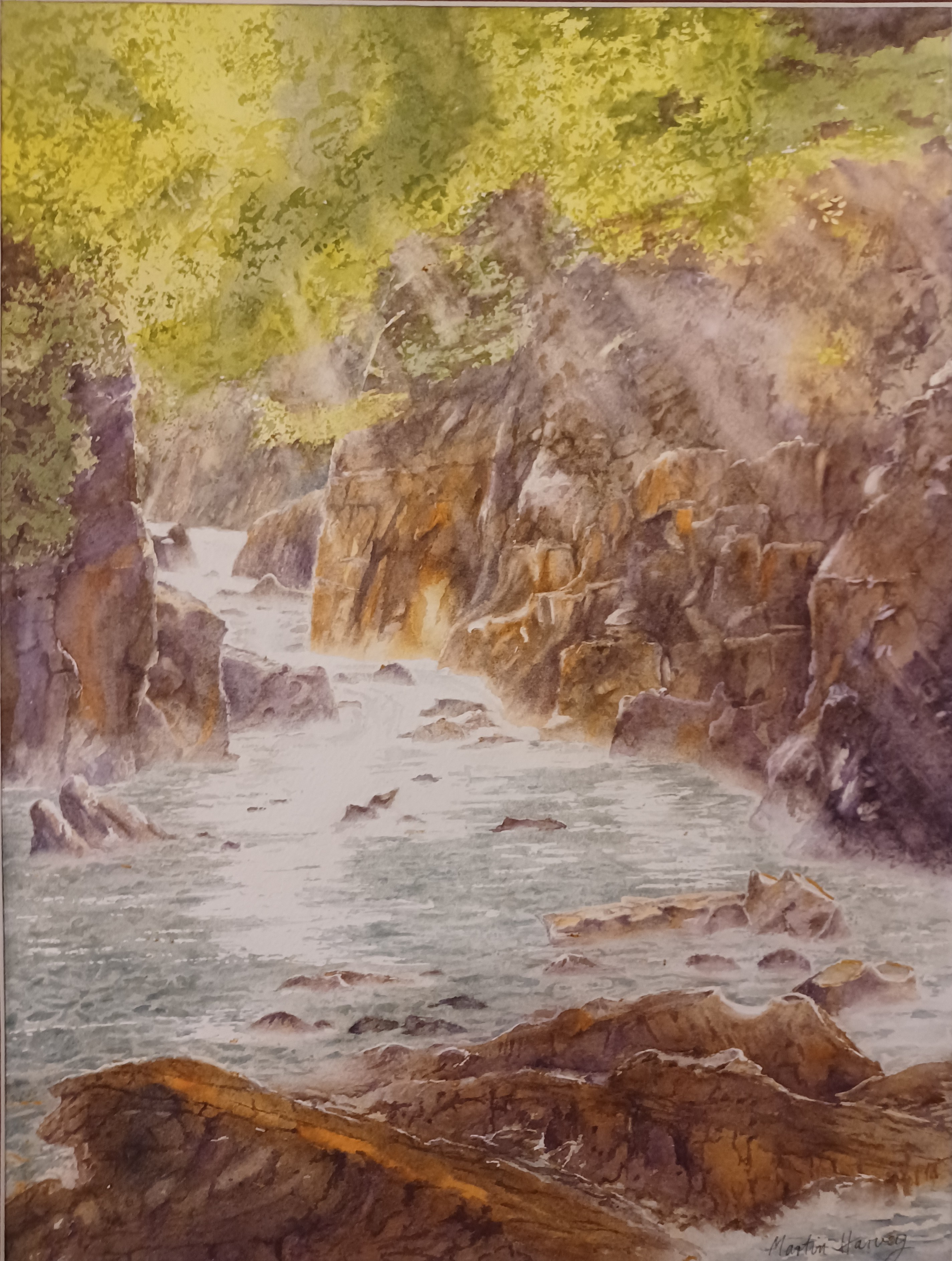 Description: A watercolour by Martin Harvey (born 1942). Martin grew up in St Mabyn and attended Falmouth School of Art from 1959 to 1963. He then became a student at Hornsey College of Art (1963-1964). He has taught art in Hampshire, at Plymouth College of Art. The artwork is framed with UV image clear glass.