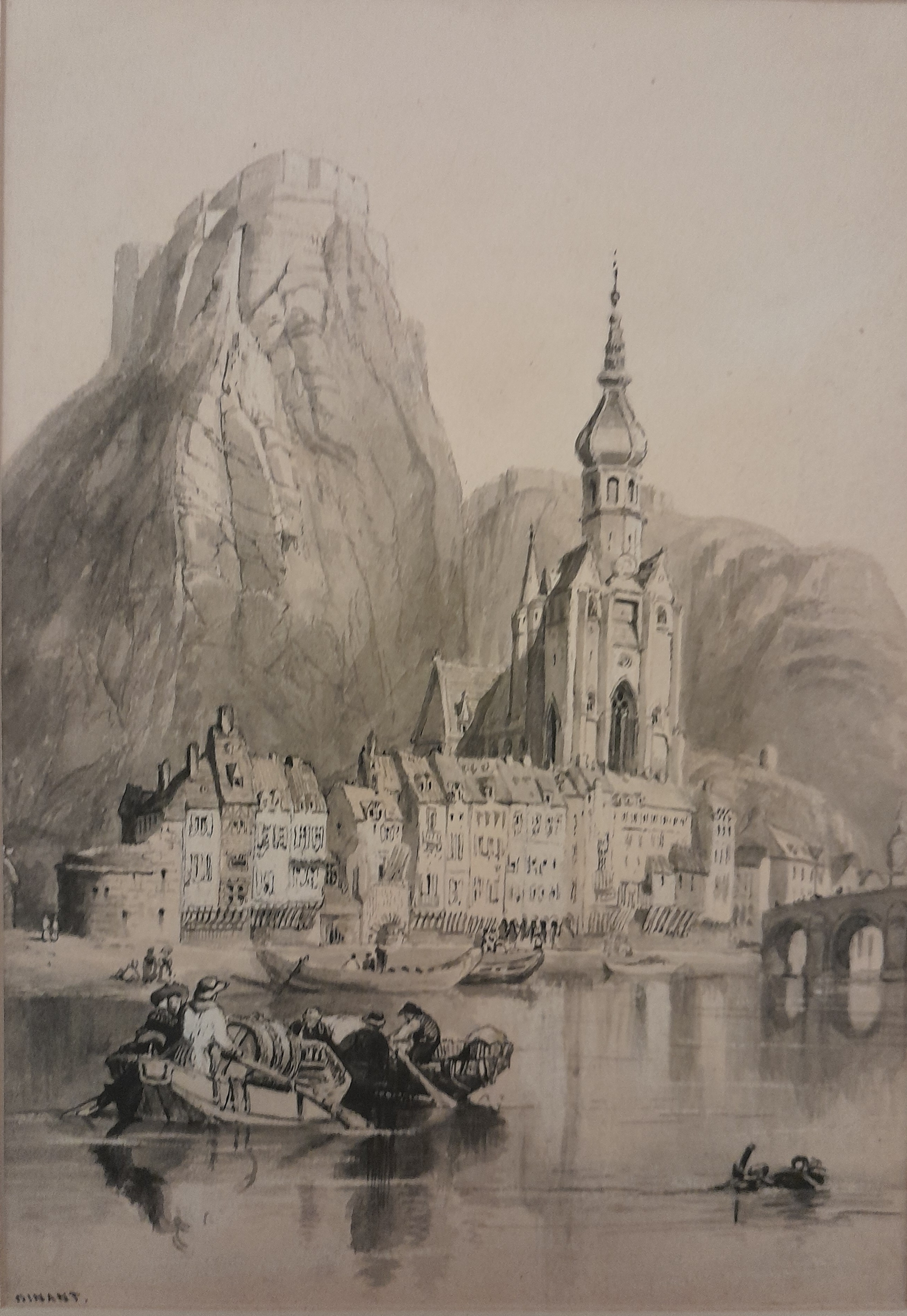 Description: A watercolour, gouache, pen and ink, attributed to Adolf Ziegler (16 October 1892 in Bremen – 18 September 1959). The artwork was created around 1838 or 1839. The location is Dinant, a town in the province of Namur, Wallonia, Belgium, situated on the banks of the River Meuse. He was Hitler's favourite painter.