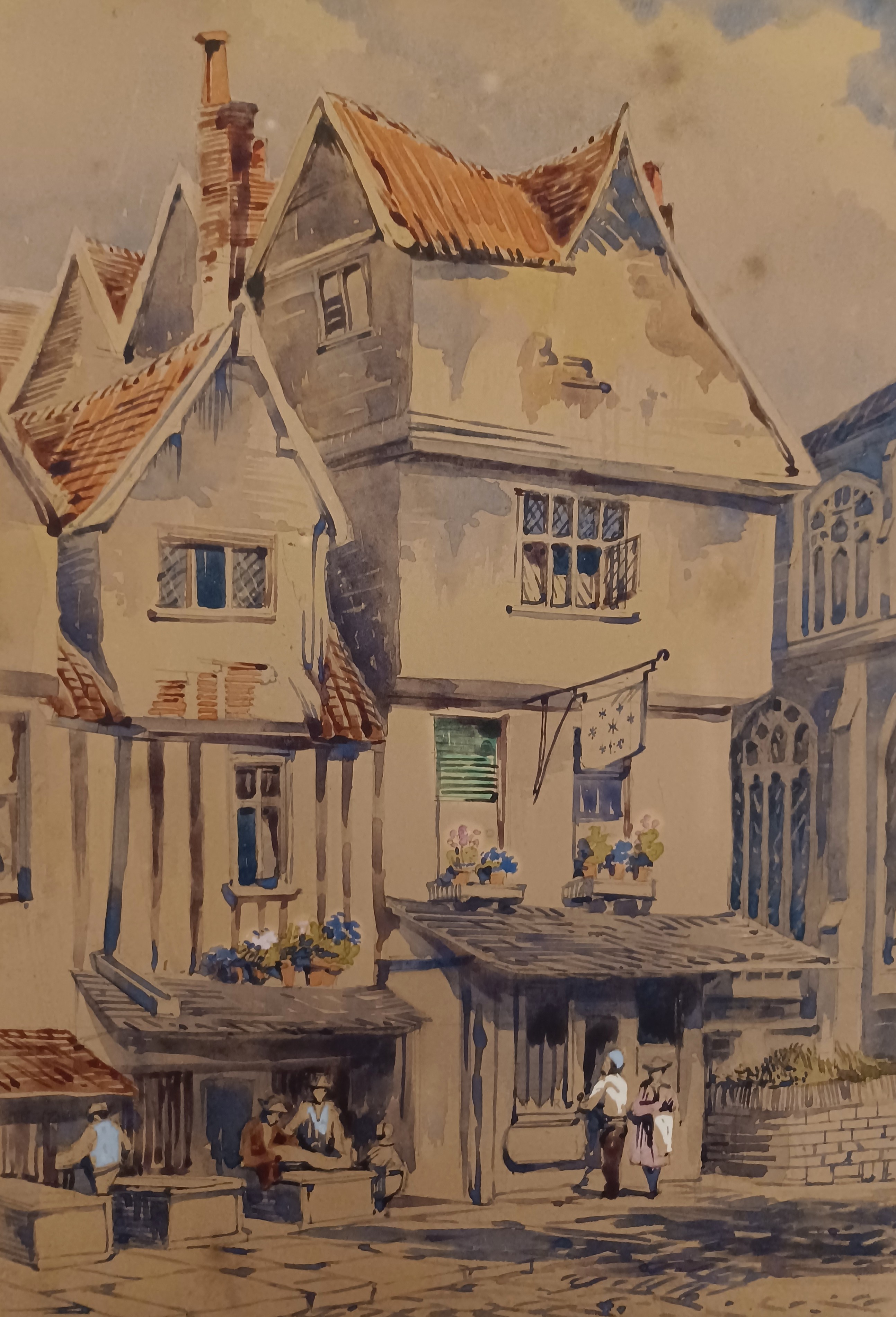 Description: A watercolour dated 1871, of a tavern with butchers’ shops next door to each other, with a church in the background that may be St Peter Mancroft, Norwich. Charles W. Fox was a British painter. He's a known artist whose style fits typical British art of that era, often seen in village scenes and rural settings. The artwork is framed with UV image clear glass.