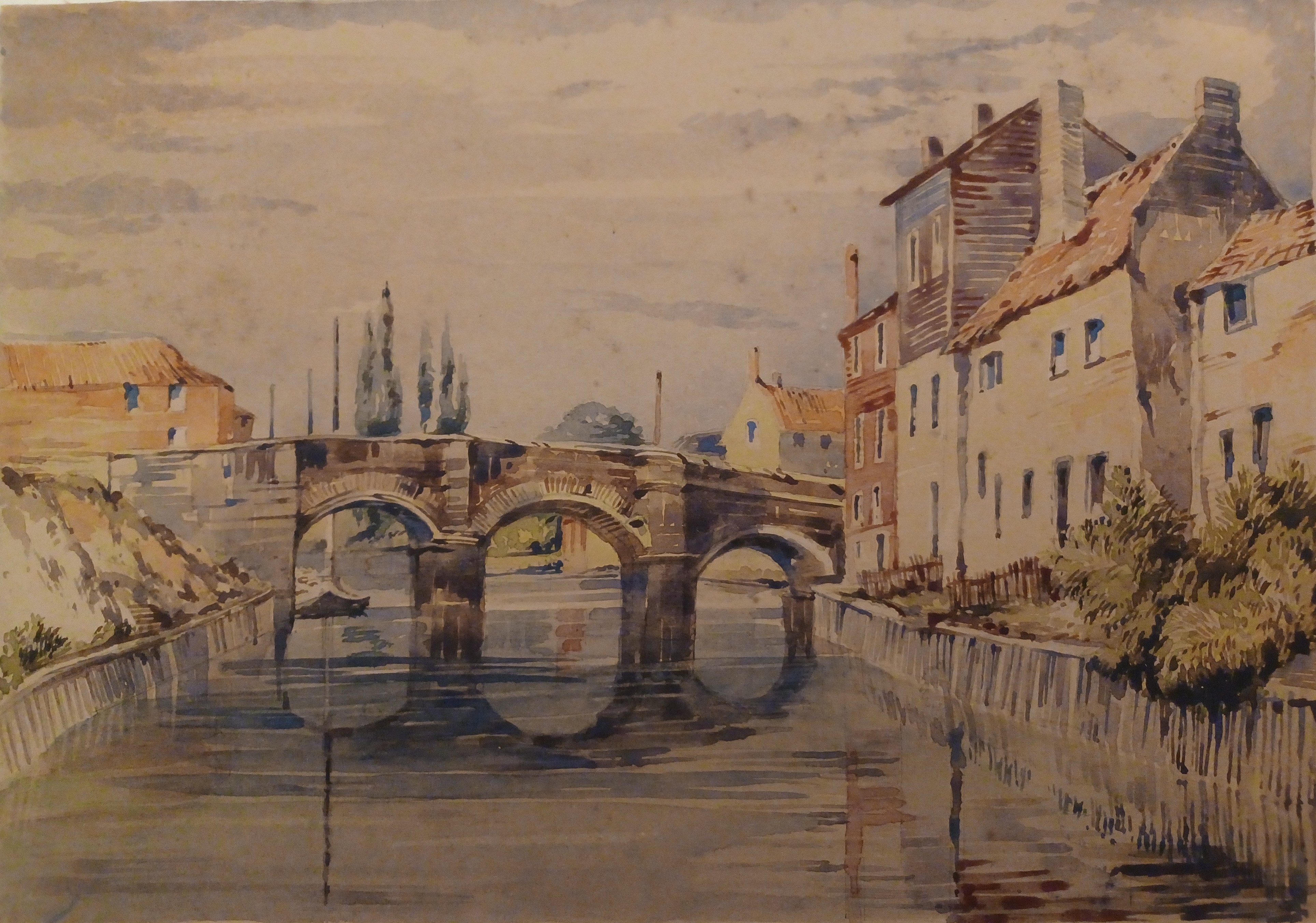 Description: Watercolour by Charles W Fox 1871 Bishops Bridge. The bridge spans the River Wensum and is located near Norwich city's Cathedral Quarter. Built in 1340, it is one of the oldest active bridges in England. It was named because it led directly to the Bishop's Palace. The bridge is constructed of flint and brick, and a semi-circular projection is a remnant of a fortified gatehouse that was part of the structure until 1791. The bridge has been a popular subject for artists over the centuries, including John Thirtle and Ernest William Haslehust. The artwork is framed with UV image clear glass.