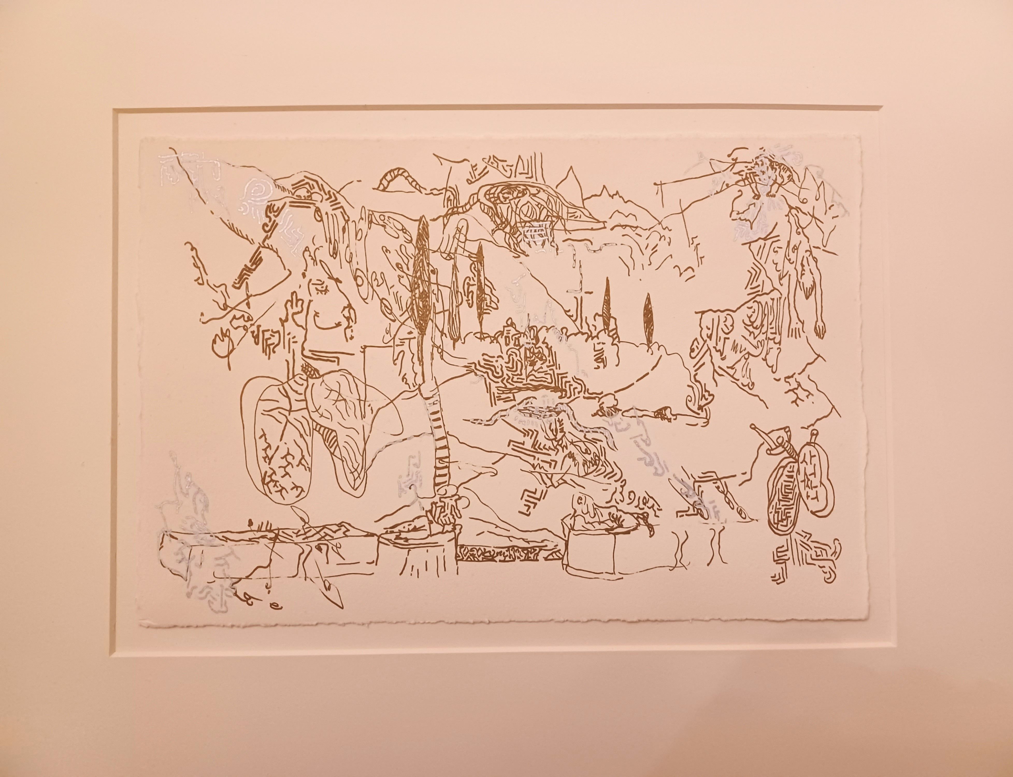 Description: This is an original pen and ink drawing with abstract elements, attuned to Ece Dalkiran. Ece Dalkiran was born in 1979 in Ankara. In 1999, she graduated from Gazi University, Faculty of Fine Arts, Department of Graphic Arts. The visual style is consistent with abstract expressionist or surrealist line art, drawing without conscious control to express the subconscious mind, leading to fluid, dream-like imagery with distorted forms.
