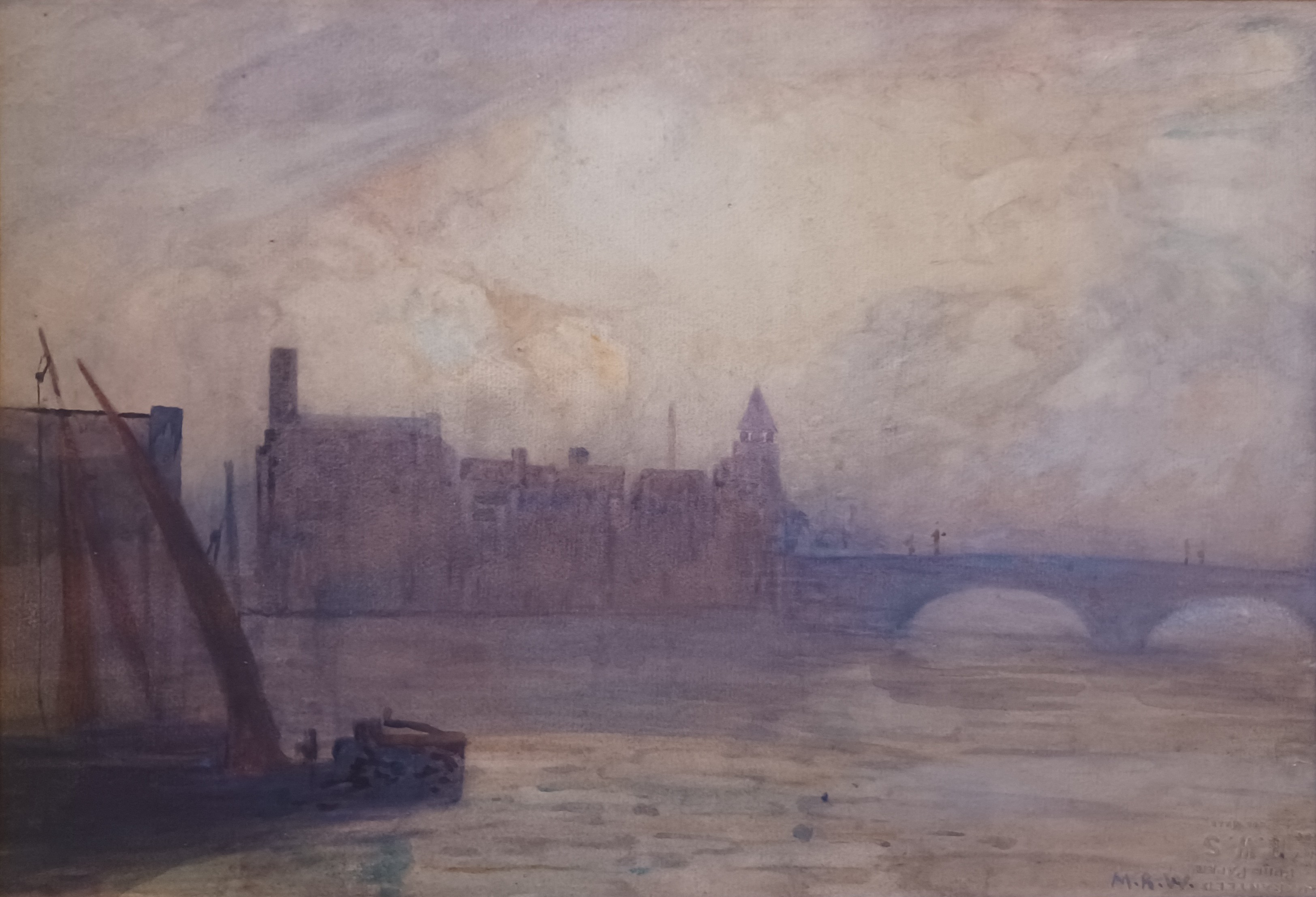 Description: Watercolour, the Thames Wharf side sunset, signed with a monogram by Mary Rogers Williams (1857-1907), an American artist. Mary frequently travelled to England and Europe for summers and extended periods, sketching landscapes and medieval towns. Her European paintings focused on capturing mood and light in landscapes, often featuring high horizons, meadows, mediaeval towns, and coastlines. The artwork is framed with UV image clear glass.
