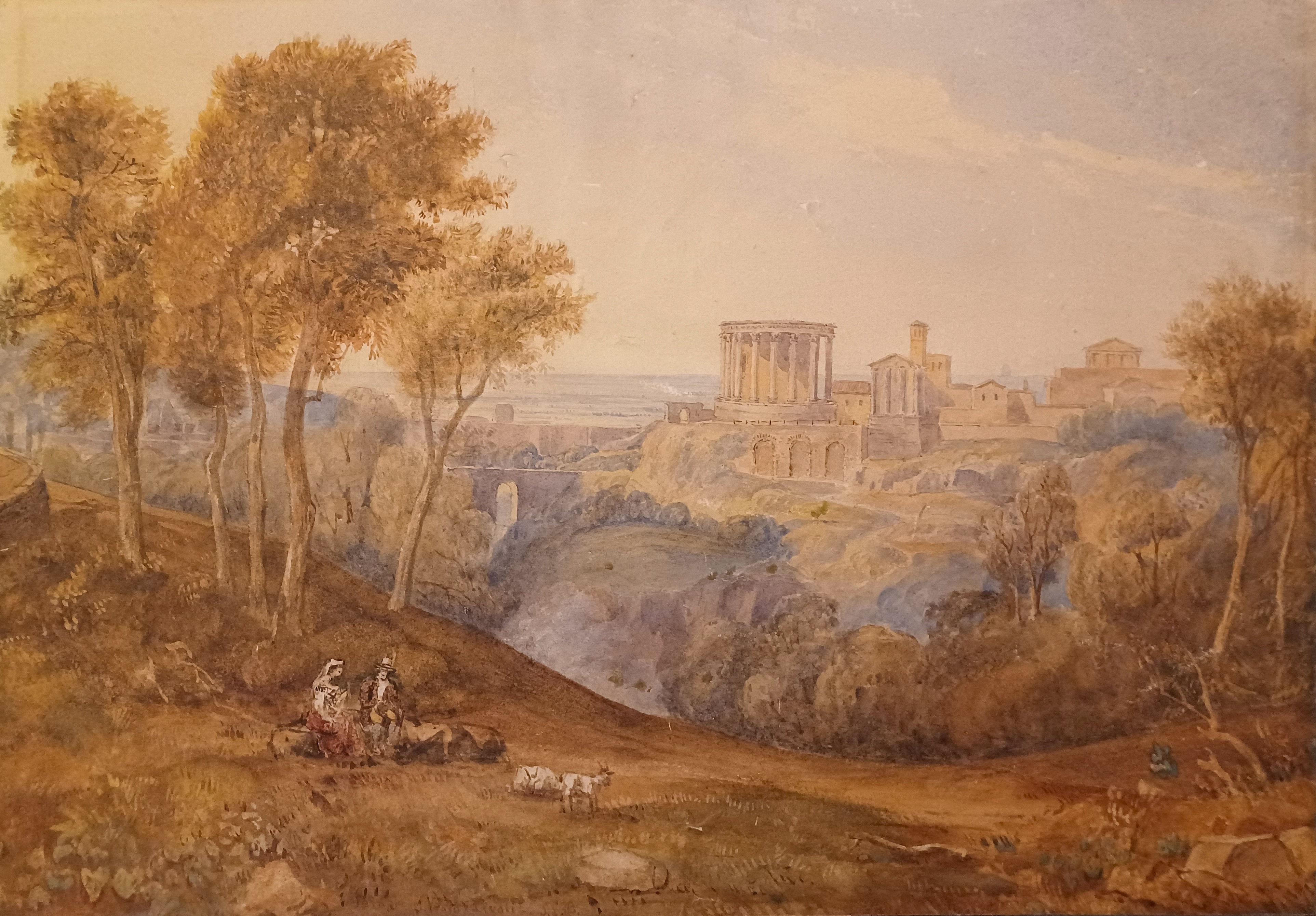 Description: Watercolour painting of the Temple of Vesta at Tivoli, Italy. This watercolour is likely an early work by Johann Jakob Biedermann (1763–1830), a Swiss painter known for his landscapes. This artist has signed this artwork with the monogram "J.J.B.", and this one is no exception, like two others. The style of the artwork is an Italianate Grand Tour classical landscape, a popular genre in the 18th and 19th centuries, notably influenced by artists like Claude Lorrain and J.M.W. Turner. This artwork is possibly suggesting an early work by Johann Jakob Biedermann with a common Italianate theme. This artwork is framed with UV image clear glass.