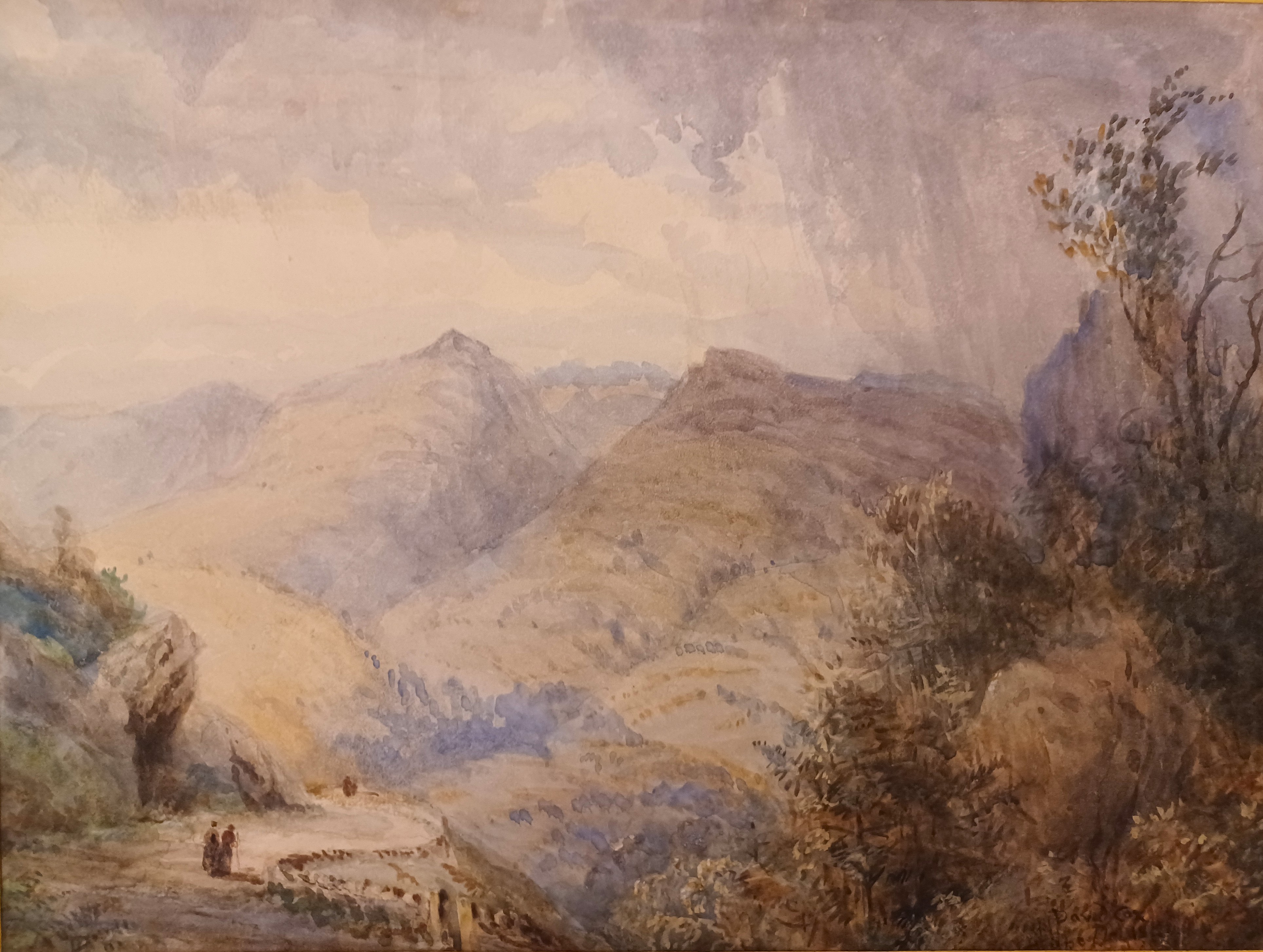 Description: A watercolour painting by David Cox Snr (1783 –1859), was an English landscape painter. It is an atmospheric landscape watercolour painting, depicting a mountainous or hilly region with figures in the foreground. The painting is signed and dated 1828 David Cox Snr RA RWS (1783-1859) was a prominent English landscape painter, primarily known for his exceptional work in watercolour and later in oils. He is considered a major figure of the "Golden age of English watercolour" and an early precursor of Impressionism. Cox exhibited regularly at the Royal Academy from 1805. David Cox Snr. depicting a mountainous region, most likely in North Wales. He frequently traveled to Wales on sketching tours, and his works are known for capturing the atmosphere and effects of changing weather and light in rugged landscapes. he spent almost all his summers in North Wales. This artwork is framed with UV image clear glass.