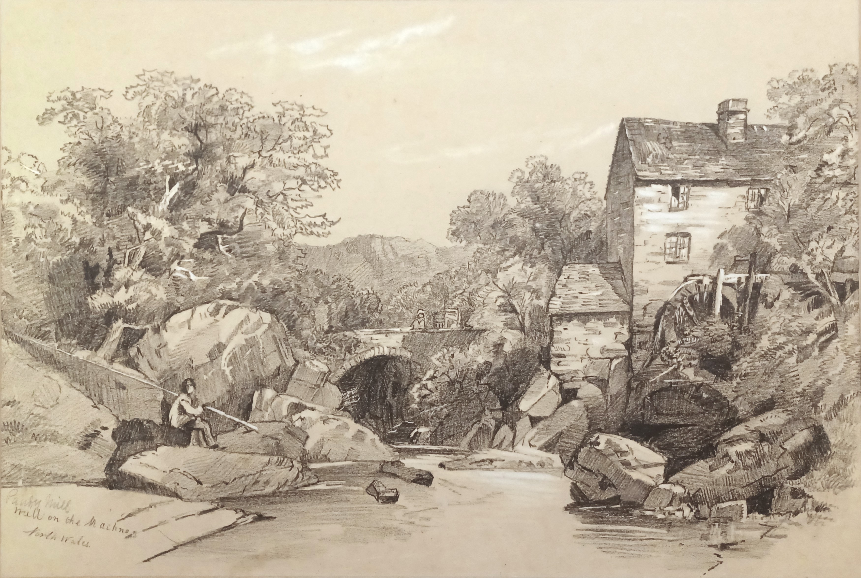 Description: This drawing depicts Pandy Mill (or Gwyndy Mill) on the River Machno in North Wales. Early- to mid-20th-century charcoal drawing study after an original drawing by the British artist James Duffield Harding (1798–1863). The composition is typical of the Romantic movement, which popularised the dramatic scenery of North Wales, including areas around Betws-y-Coed where the mill is located. The drawing captures a picturesque scene with rugged rocks, flowing water, a small bridge, and the traditional mill building.
