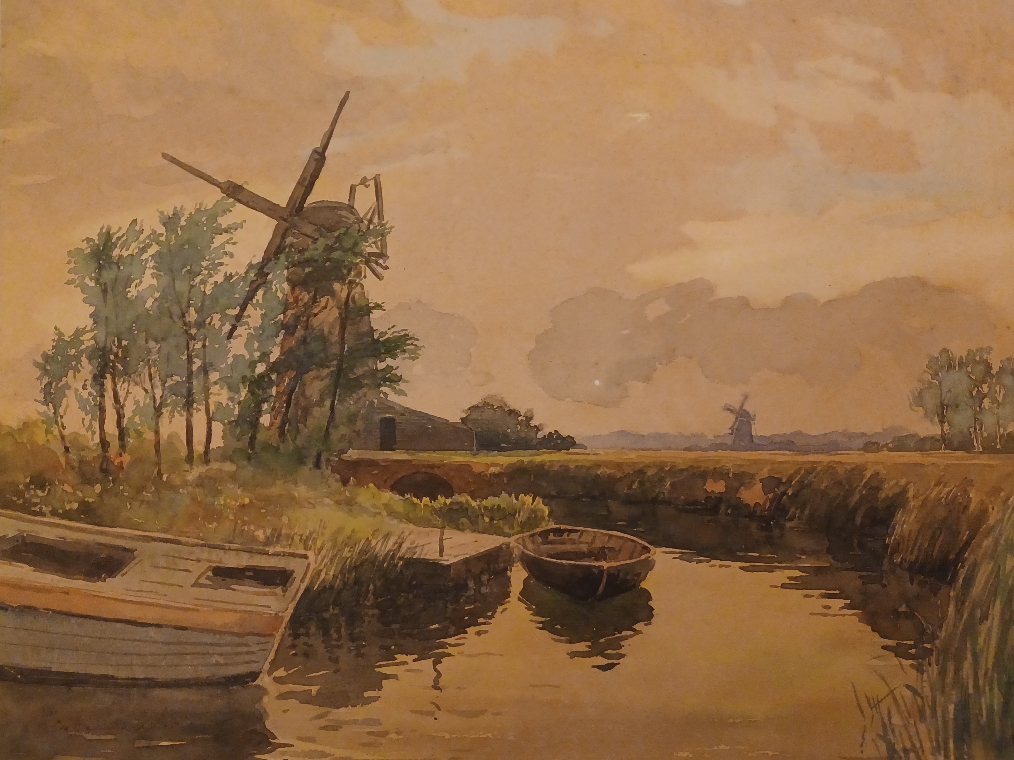 Description: A watercolour painting, unsigned, After C.A. Hannaford junior (Charles Arthur Hannaford, 1887–1972) This artist was well-known for his depictions of the Norfolk Broads. He originally pursued a career in banking before retiring in 1935 to settle in Wroxham, Norfolk, where he established the company Broads Tours Ltd. His paintings of the local landscape and waterways were very popular and often featured in the company's promotional booklets, such as The Charm of the Norfolk Broads. The Artwork's Style and Content The scene is typical of Hannaford's style, focusing on the atmosphere and light of the Norfolk landscape, featuring windmills and boats along the water. The original works by both the junior and senior Hannaford can sometimes be difficult to distinguish as their styles had similarities, but both are recognised for their skilled use of watercolour.