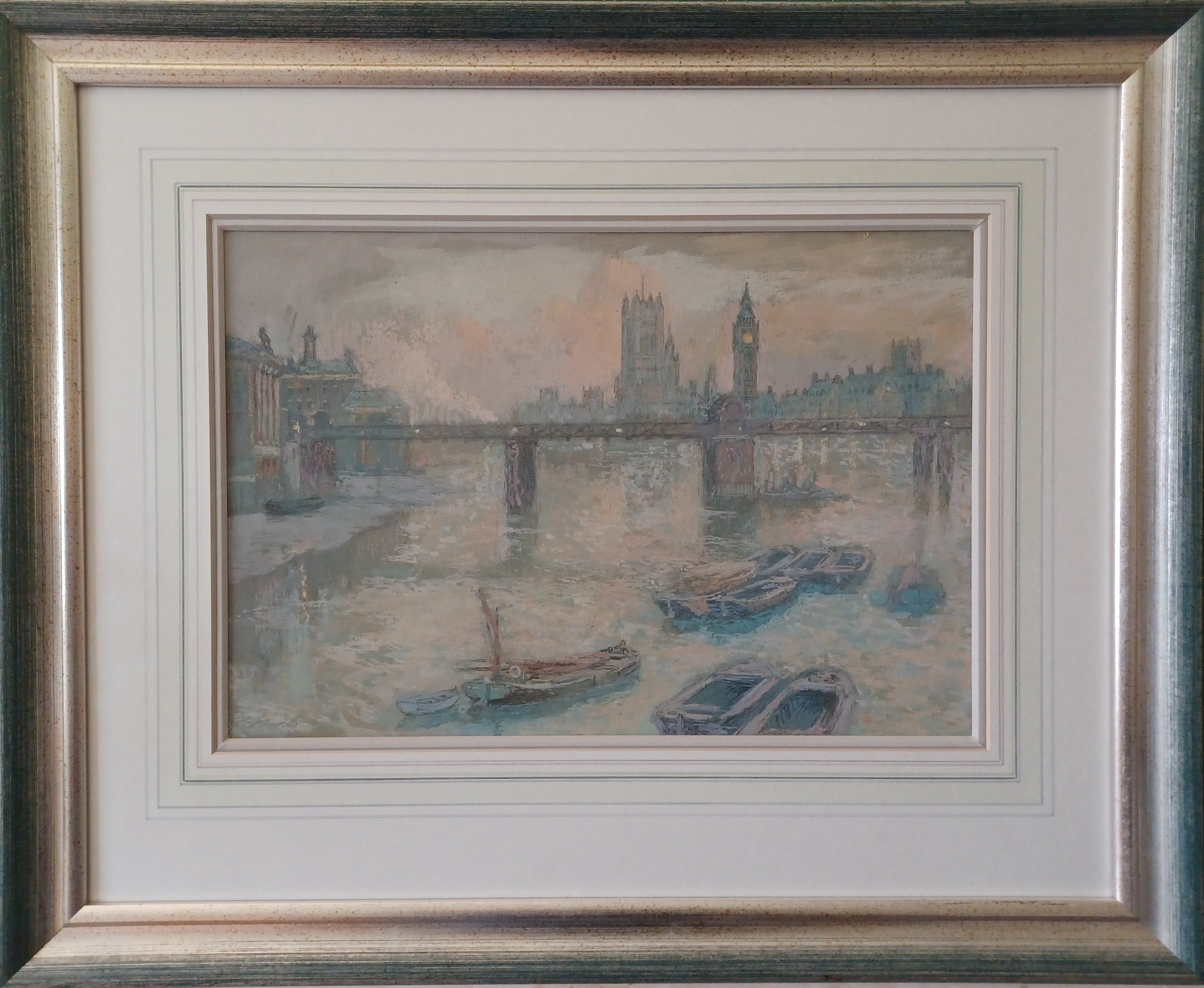 Description: This watercolour with gouache and coloured chalk artwork is by the artist Claude Marks. Claude Marks (1899–1915) was a French artist known for his impressionist style. This specific artwork depicts a hazy, atmospheric view of the London skyline from the River Thames, featuring several boats in the foreground and a prominent view of the Houses of Parliament and Big Ben in the background.