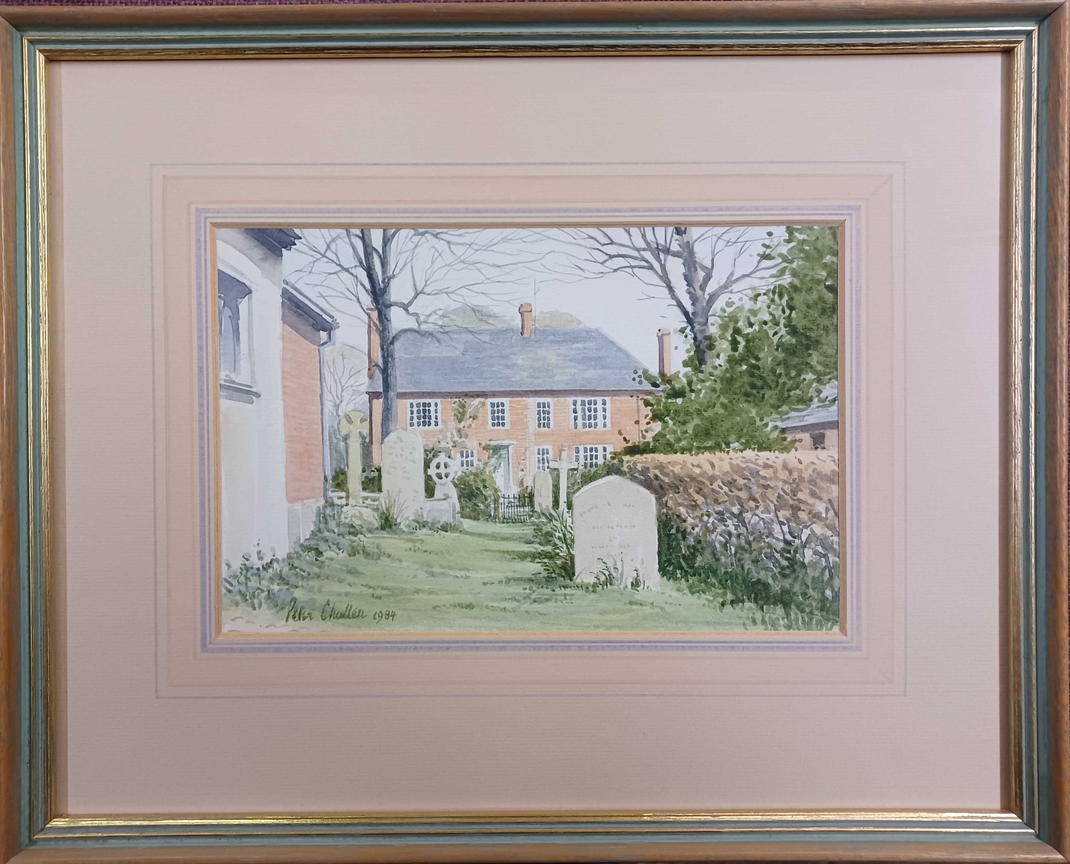 Description: This beautifully detailed original work, a 1984 watercolour by Peter Challen, depicts a view from the churchyard of All Saints Church in Alton Priors, Wiltshire, looking toward the Old Rectory (the large brick house in the background). The painting captures the historic path leading from the church toward the neighbouring village of Alton Barnes. The two villages are extremely close, often referred to together as "The Altons". The Artist: Peter Challen was a 20th-century artist known for his detailed and delicate architectural watercolours of English village scenes and historic priories. The large house in the background is the Old Rectory at Alton Priors, a Grade II listed building that dates back to the 18th century. The artwork is framed with UV image clear glass.